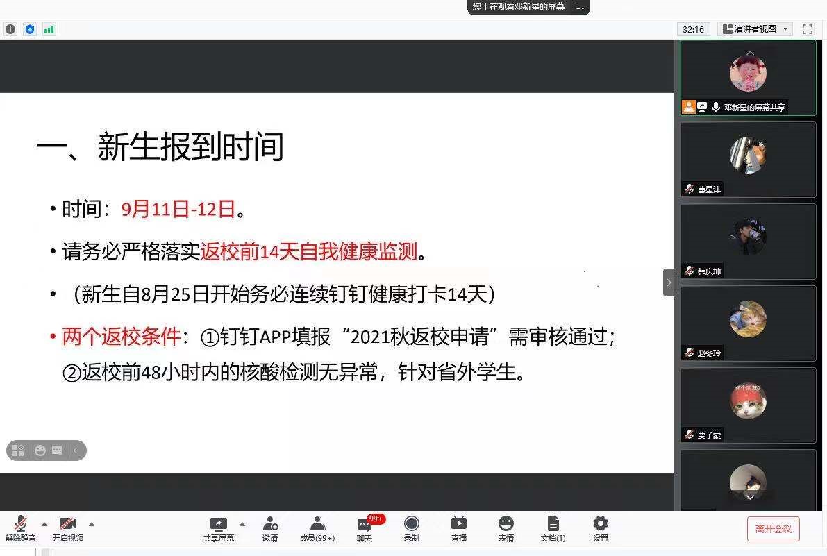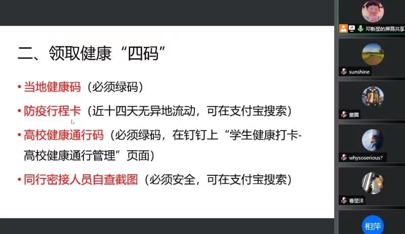主题班会主要包括三部分内容,首先向学生讲述当前学校疫情防控管理的各项内容及注意事项,强调:学生返校后两周非必要不外出;应积极接种疫苗,并如实报告疫苗注射情况;坚持钉钉每日健康打卡;不前往中高风险地区,不在中高风险地区中转;返校途中要做好个人防护,避免感染风险;完成返校前48小时内的核酸检测。班会还对学生秋季返校安排及开学前两周的外出请假流程进行了统一说明。同学们也有许多返校前的困惑,邓老师依次进行了解答,同学们纷纷表示能够理解学校疫情防控的各项要求。会议接近尾声时,邓老师将提前整理好的返校须知电子版与同学们分享,并再次提醒同学们要合理规划返校路线,保证返校全程均为低风险地区,切实做到不漏报、不谎报、不错报、不瞒报。
