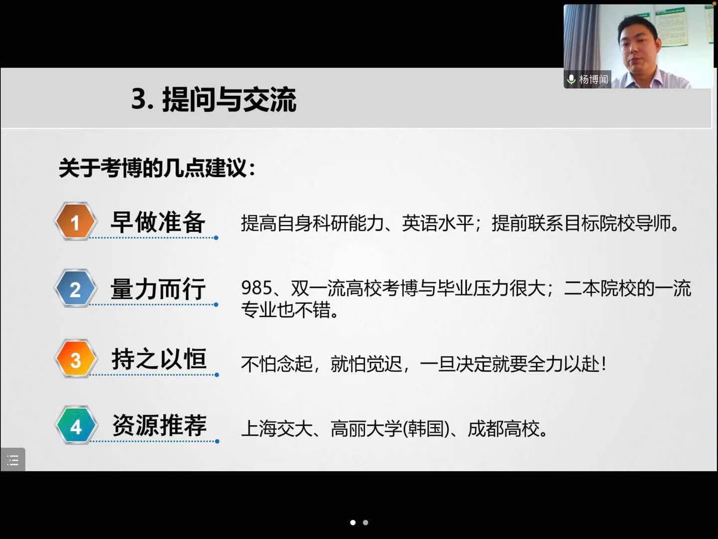 硕士学位,2019年毕业于上海交通大学获得博士学位,在博士期间以第一作者身份发表多篇SCI期刊,后前往韩国高丽大学从事博士后研究工作,现任成都大学特聘副研究员,他用自身的成功经历鼓励同学们不怕困难,继续追求更高的目标。随后,杨老师风趣幽默地向同学们分享了自己的考博经验,包括考博流程、复习准备等关键信息,并鼓励同学们把握机遇、积极考博。接着,耐心讲解介绍其博士与博后期间的研究课题——超临界水氧化,认真解答同学们提出的问题。最后杨老师基于同学们提出的问题,总结了几点关于考博的建议,一要早做准备,提高自身科研能力创新和英语阅读水平;二要量力而行,结合自身能力和目标选择深造高校;三要持之以恒,不怕念起,就怕觉迟,一旦决定就要全力以赴。