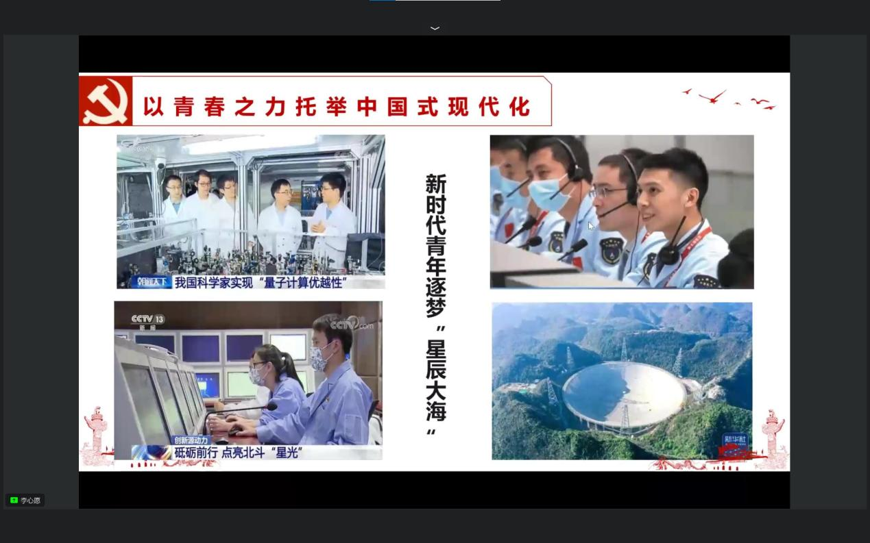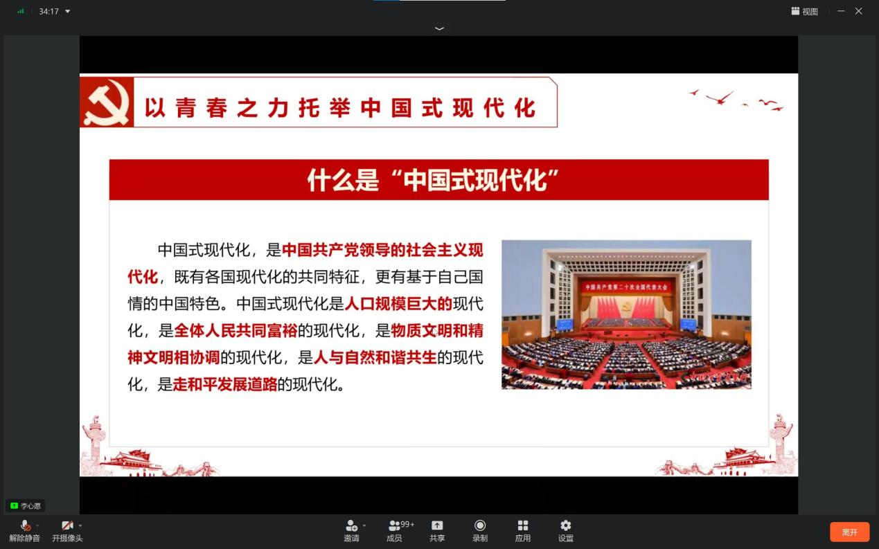 在这次会议中,李心愿老师围绕青年主体,以“青春之力托举中国式现代化”为中心,向同学们详细解读了“中国式现代化”这一概念,呼吁同学们以青春活力助力中国式现代化并寄予殷切希望。通过本次培训班明确指出党的二十大后中国青年的奋斗目标。