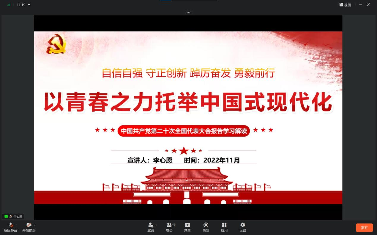 通过钉钉会议召开主题为“学习宣传贯彻党的二十大精神”的青年马克思主义者培养工程大学生骨干培训班暨班长团支书培训班第四讲。出席培训班并授课的老师是学院团委书记李心愿老师。