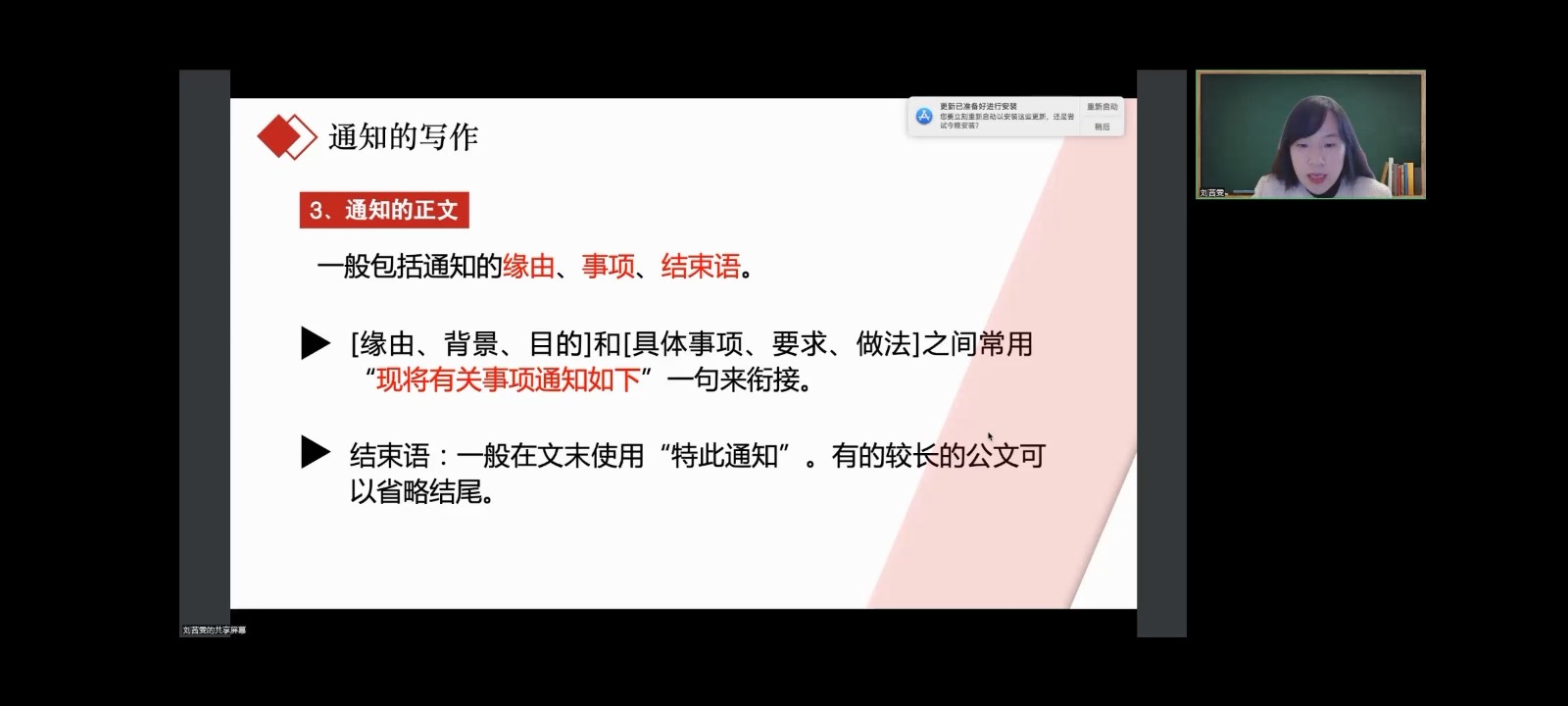 刘老师以“为什么要学习应用写作”为出发点,为同学们讲解了公文写作的意义。从“什么是公文”“公文的类型”“常见公文的写作方法”等三方面进行了经验分享。刘老师结合自己多年的公文写作经验和关工作中遇到的一些实际案例,深入浅出地介绍了请示、通告、报告、通知、函以及会议纪要等常见公文的格式要求、写作技巧以及常见的错误示例。