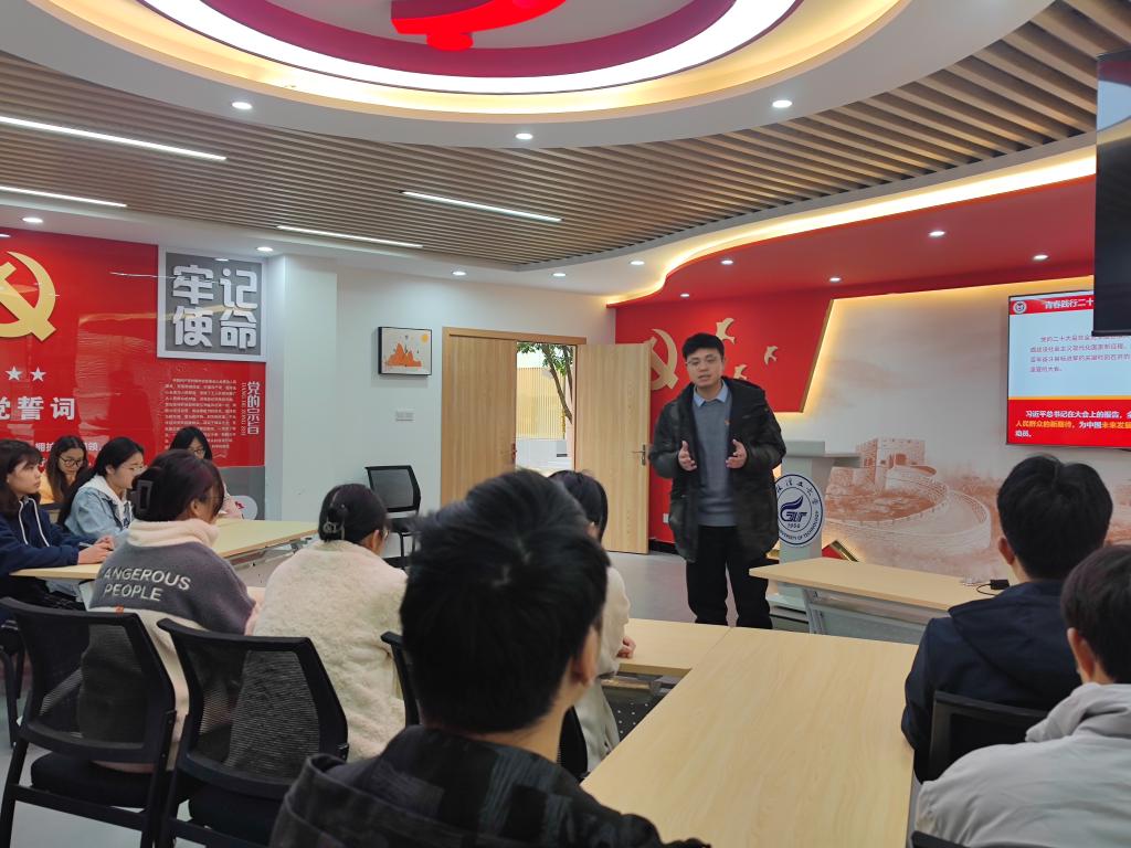 广大青年学生坚定理想信念,坚定不移听党话、跟党走,切实把思想和行动统一到党的二十大精神上来,争做有理想、敢担当、能吃苦、肯奋斗的新时代好青年。2023年2月24日上午,学院学工办唐源江老师在“明园”一站式学生社区思政大讲堂,以“青春践行二十大”为主题进行了学院示范主题班会。学院党委书记姜子亮、副书记郝文佳及全体辅导员、班主任代表出席示范主题班会。