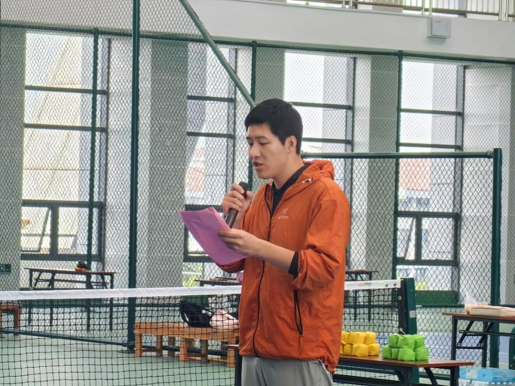 的党委副书记郝文佳老师进行开幕式致辞,他表示热烈欢迎各个学院的到来,并强调了比赛中协作共赢的重要性,呼吁同学们重视自己的心理健康,鼓励同学们在运动中释放压力,在运动中放飞心灵。