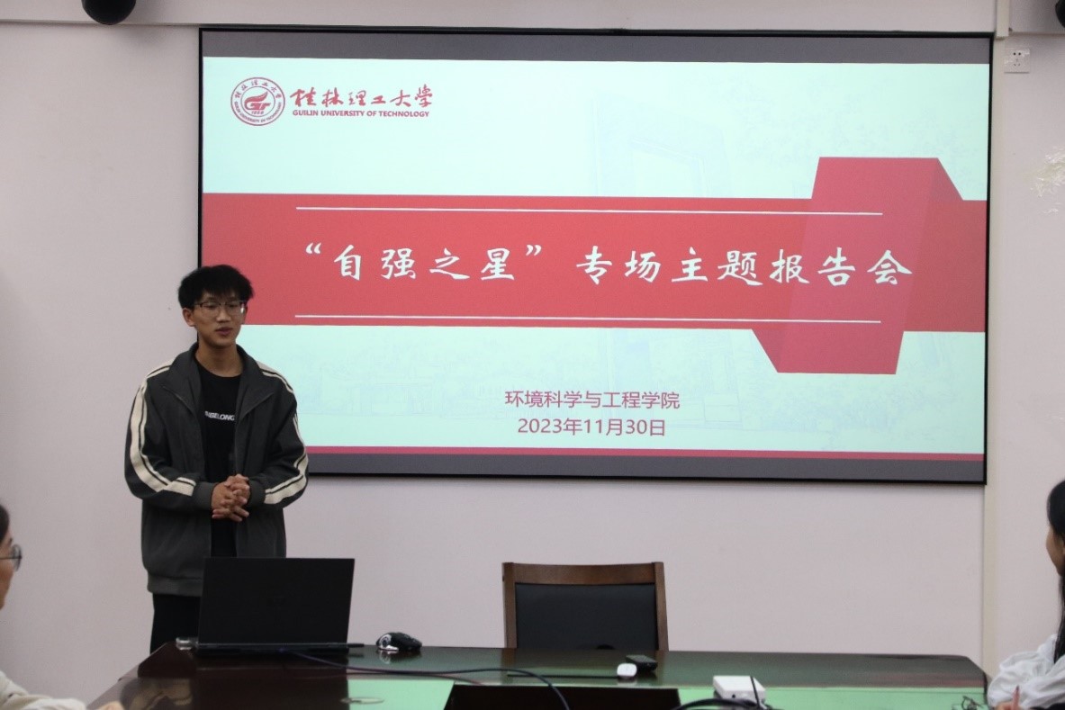 2023年“自强之星”候选人,水文与水资源工程2021-2班莫家欢同学作主题交流。莫家欢曾获国家奖学金、国家励志奖学金、“建宏科技”奖学金、校级特等奖学金等荣誉。会上,他以“追风赶月莫停留,平芜尽处是春山”为主题,从厚德笃学、实践致知、社会服务三个方面讲述了自己如何扎根校园,用专业知识引航蓄能,用青春为乡村振兴赋能的故事;随后,围绕自己在学习、竞赛、社会实践等方面的经验与同学们进行了分享,勉励大家在大学期间既怀抱梦想又脚踏实地,既敢想敢为又善作善成,立志做有理想、敢担当、能吃苦、肯奋斗的新时代好青年,即使现在的自己只是一个“小树苗”,通过不懈努力,相信定能长成一棵“参天大树”;最后,莫家欢积极号召大家要努力承担作为一名环保人的责任,不断将自身知识转化为服务社会的能力,将青春之花绽放在祖国需要的地方。