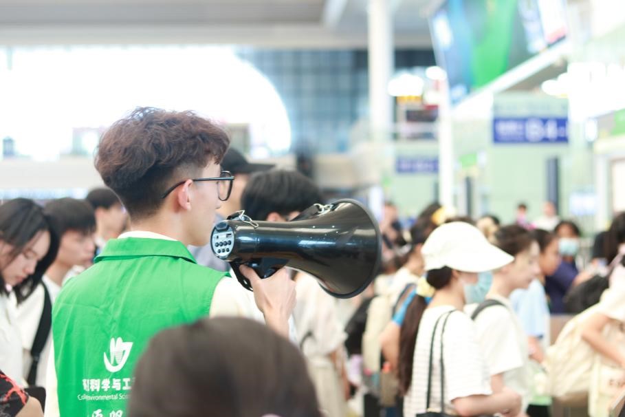 实践团成员在车站内引导乘客排队检票