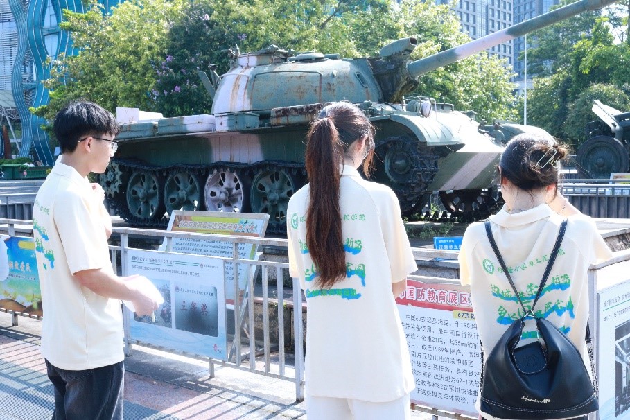 离开文化公园,实践团一行来到了防城港国防教育基地,参观了“退休”的飞机、坦克、大炮等重型武器。实践团成员们围在这些重型武器周围,仔细观察着它们的每一个细节,从飞机的流线型设计到坦克的坚固装甲,从大炮的精准炮口到复杂的机械构造,无不让他们感到震撼和自豪。他们认真阅读讲解牌上的国防知识与名人事迹,那些英勇无畏的军人故事和我国国防事业取得的辉煌成就,让他们对国家的安全和发展有了更加深刻的认识和了解。