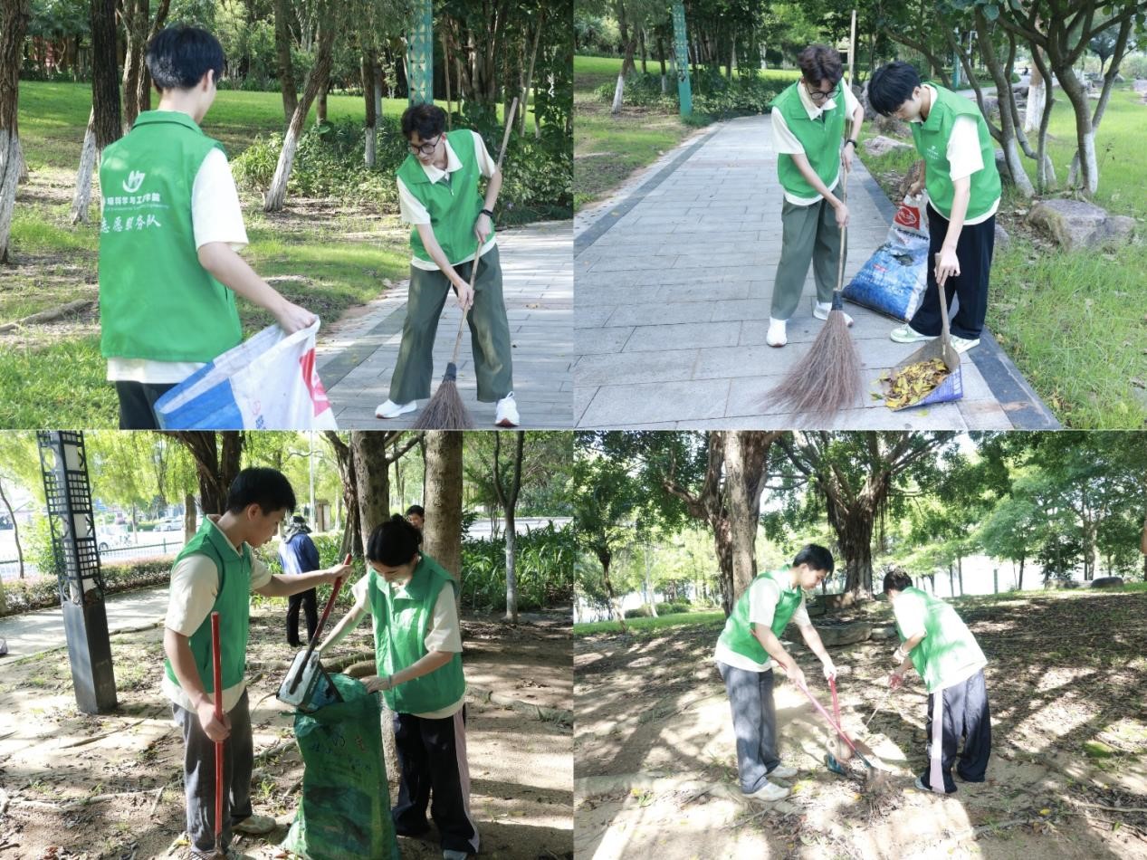 活动首站,实践团来到了风景如画的北部湾海洋文化公园。走进园内,园林景观优美,亭台楼阁雅致,海洋诗书苑、景观石、名人书法作品、特色雕塑直观地展现了这种城市深厚的海洋文化。随后,成员们拿起垃圾袋和扫帚,清理公园内的垃圾和杂物,用实际行动守护这片蔚蓝,为游客和市民创造了一个整洁、舒适的环境。在清理垃圾的同时,他们还向过往游客宣传环保理念,呼吁共同守护好这片宝贵的生态资源。