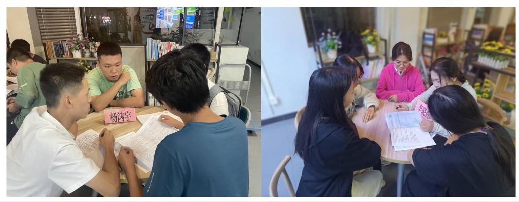 在经验分享会环节,“朋辈老师”结合自身备考经历,从备考策略、时间管理、题型解析、应试技巧等多个方面进行分享,为学业困难学生提供了宝贵的备考经验,激发了他们面对考试的信心与勇气。在小组讨论环节,五位“朋辈老师”与学业困难学生形成“一对多”的学业帮扶结对小组,他们用自己的学习经验和方法,耐心指导学业困难学生解决备考过程中遇到的难题,共同制定学习计划,帮助学业困难学生掌握学习技巧,提高学习效率。