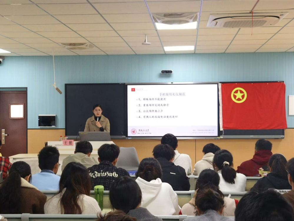 在本次培训中,王媛老师围绕“礼仪对青年的重要性”展开讲解。培训内容涵盖了学生骨干基本行为礼仪、通用礼仪、关系处理技巧以及会场布置的基本要求等多个方面。王老师结合丰富的实际案例,生动形象地阐述了工作场合和日常生活中各种礼仪的要点。随后,为了让同学们更好地理解和掌握礼仪知识,通过模拟实际工作场景,如会议的自我介绍、座位的安排等,将所学的礼仪知识灵活运用到实践中。王老师对同学们的表现进行了细致的点评和指导,使大家对工作礼仪的重要性有了更加深刻的认识。