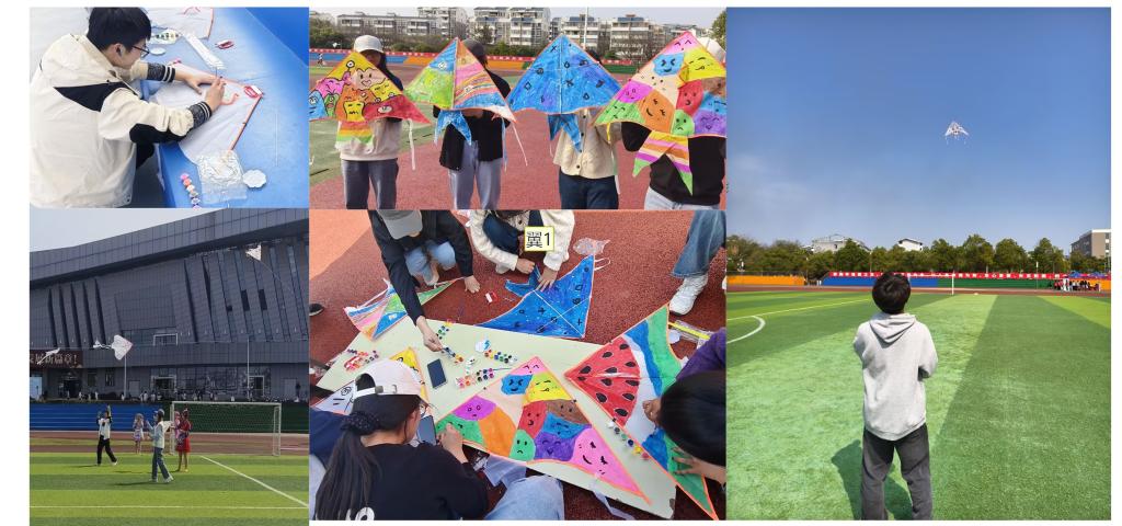 活动分为手绘创作与协作放飞两个环节。在工作人员的引导下,学生们领取空白风筝、颜料与画笔,围绕“情绪解压”“未来愿景”等主题进行DIY创作。手绘过程通过色彩与图案的外化表达,帮助学生直观觉察情绪,重构积极认知。创作完成后,学生们以小组为单位协作放飞风筝。操场上,各组调试线轴、调整角度,奔跑与欢呼声此起彼伏。一只印满笑脸的风筝率先升空,在风中轻盈摇曳,几只绘有“情绪小怪兽”的风筝紧随其后,抽象的线条勾勒出愤怒、焦虑与快乐交织的情感状态。