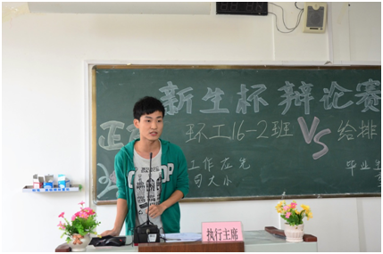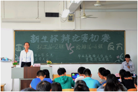 辩论队队长冯源及优秀队员担任评委。比赛双方分别为环境工程16-2班和给排水16-4班,他们围绕“毕业生选择工作应先重视公司大小还是岗位高低”的辩题展开辩论。