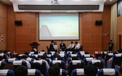 党委副书记郝文佳热情致词,并对到场的学生寄予厚望,希望我们将来对社会做出更大的贡献。报告会在大家的期待中拉开了帷幕。腾鹏飞、赵学爽、韦壮绵、史孔鹏四位优秀学子分别从学习、干部、实践、考研四个方面给我们带来了一场振奋人心的报告会。四位优秀学子做完报告后,与大家开展了一场座谈会,主持人就学习、恋爱等几个方面对四位优秀学子提出了问题,他们针对不同的问题也给出了自己的看法。座谈会结束后,进行了资助月优秀感谢信和“助学筑梦,励志成才,担当有为”征文比赛获奖的同学颁奖。
