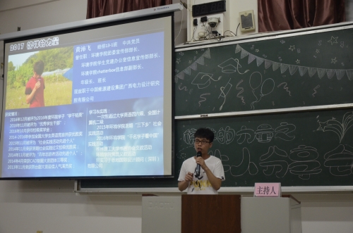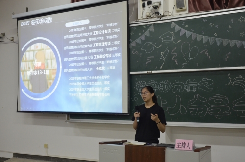 于雁山校区05314教室举办了“榜样的力量——牛人分享会”。参加本次分享会并发表演讲的优秀毕业生分别是黄沛飞、何苗、唐丝裙、陆峣以及谢雨杏同学。
