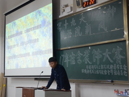 比赛在唐红兵老师精彩的致词声中拉开帷幕。决赛共有十组选手,通过参与评选的宿舍代表播放PPT并讲解宿舍装饰想法以及心得进行评比,竞争可谓是异常激烈。在比赛中,通过游戏环节充分活跃现场的紧张气氛,在互动环节中,唐老师、贺老师也与同学们一起积极参与其中。最终经过激烈的角逐,比赛结果由主持人宣布获奖宿舍名单,分别是:一等奖:9B510,二等奖:2A409、6A502,三等奖:6A509、2A413、4C312,优秀奖:4C208、6B101,最佳人气奖:2A413,由唐老师和贺老师为获奖宿舍颁奖后合影留念,比赛圆满结束。