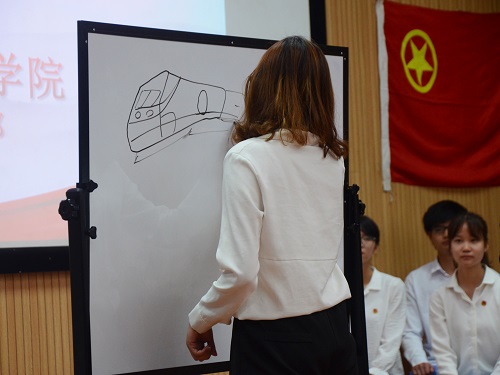 活动伊始,一首团歌《光荣啊,中国共青团》营造了现场庄严的气氛。在观看了《建国伟业》视频后,同学们根据视频的内容积极回答主持人提出的问题,如五四运动爆发的时间、原因及结果。歌曲《国家》和诗歌朗诵《我的祖国》尤为震撼人心,激情澎湃的歌声,声情并茂的朗诵,展现了同学们深沉的爱国之情。“图说新时代”环节极富创意,同学们在画板上画出了自己心目中的新时代。活动接近尾声,彭新媛同学在致辞中说到“青春是我们最大的财富,祖国是我们坚实的后盾,青少年就应该在自己最富有活力、富有朝气的年纪努力学习,为祖国建设贡献自己的力量。”