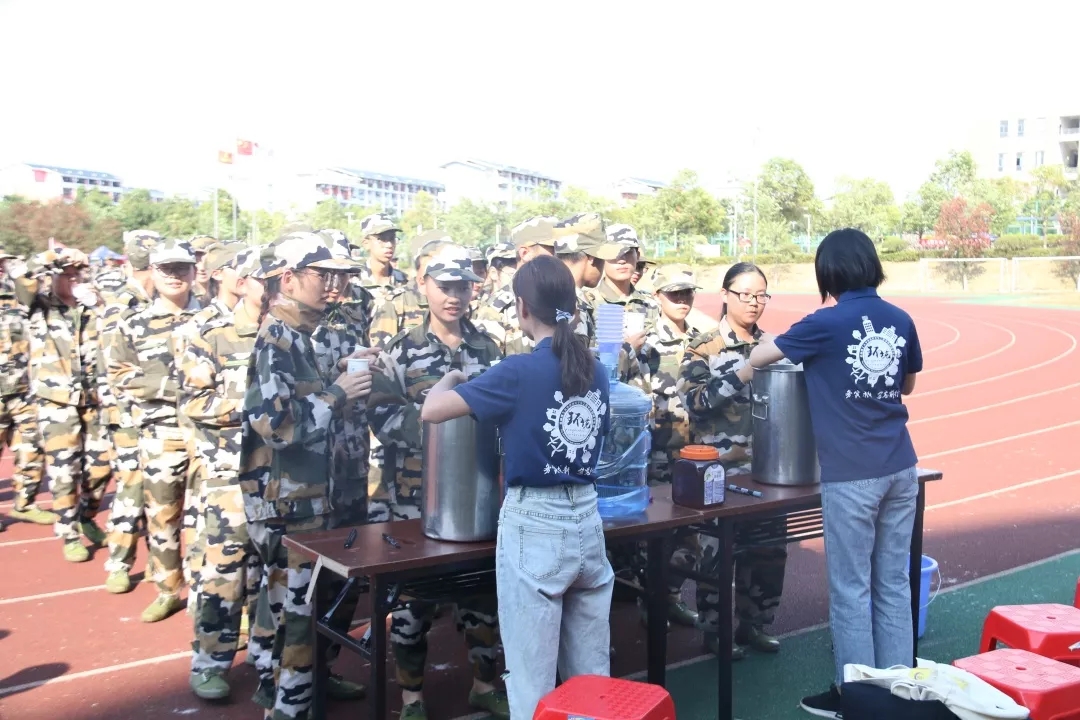 团委•学生会给军训的萌新们举办“凉水去酷暑,关爱暖人心”的送凉茶活动。
