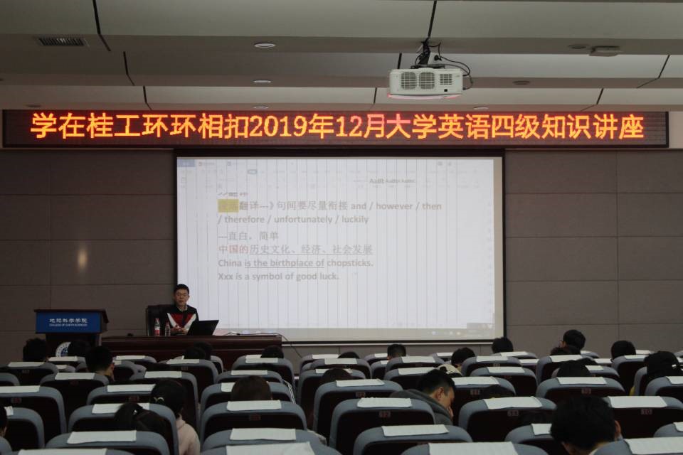 讲座开始,屠浩明老师就向同学们介绍英语四级对于同学们的重要性,并且对大学英语四级的听力、阅读、翻译、写作这几个部分所占分值进行说明,随后从做题顺序,做题注意事项,做题技巧几方面进行介绍。重点向同学们介绍做题的技巧。屠浩明老师着重介绍翻译题和写作题的做题技巧。最后,屠浩明老师鼓励同学们好好学习英语,同时也祝愿同学们能够在不久的四级考试中,能够金榜题名。