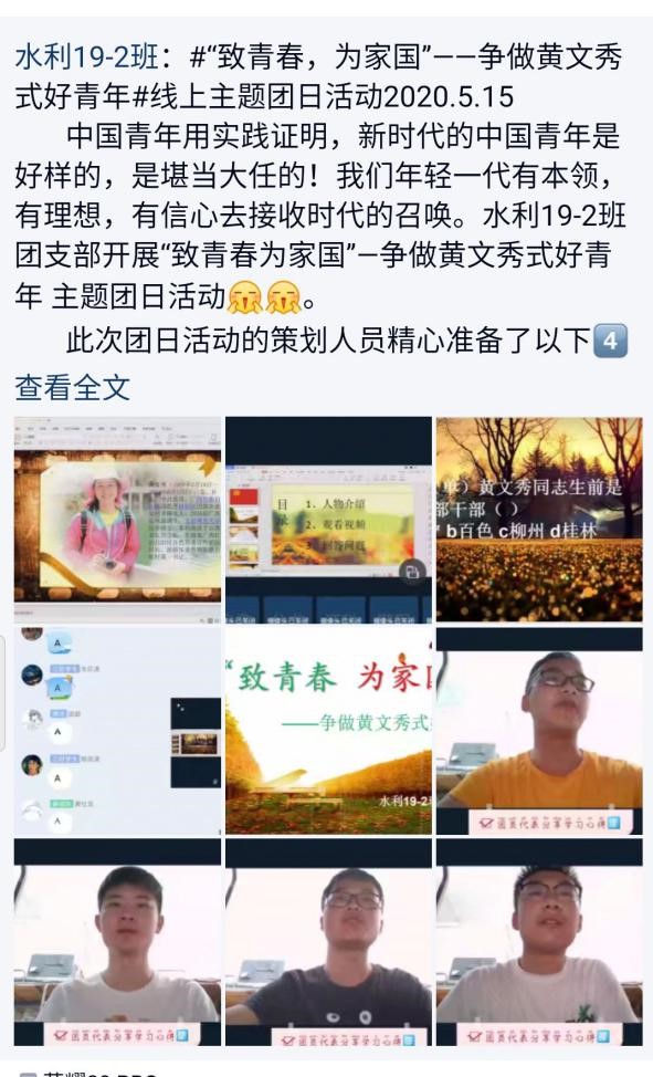 5月9日-5月16日期间组织开展了“致青春,为家国”—争做黄文秀式好青年主题团日活动。为切实开展好本次团日活动,许多团支部采用钉钉线上与QQ群聊的形式开展团日活动,也有部分团支部采取线下开展团日活动的形式,积极学习黄文秀书记相关事迹与精神。
