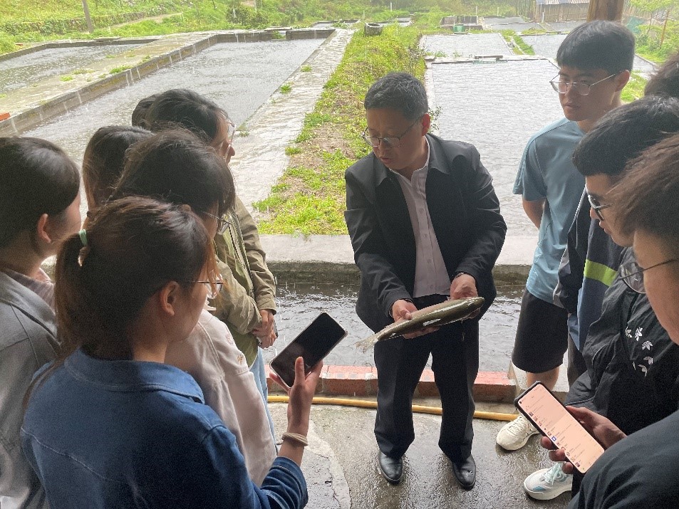 随后,一行人前往资源县中峰镇冷水鱼基地进行参观实习。基地负责人肖章息从冷水鱼基地基本情况、养殖专业特点与优势等方面进行了介绍。随后吴志强教授进行现场教学,向同学们介绍了虹鳟的分类特点以及在水产养殖中的前景,以鲜活的案例加深了同学们对冷水鱼养殖的认识,给同学们上了一堂生动的实践课。双方就学院相关专业人才培养方案如何进一步结合企业行业及社会需求进行调整完善进行了深入探讨,并就进一步开展合作达成一致意见,同时为黑料吃瓜网