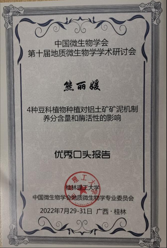 硕士研究生熊丽媛、李雪松在研究生论坛分别以“4种豆科植物种植对铝土矿矿泥基质养分含量和酶活性的影响”“ 平果铝土矿区复垦土壤细菌群落特征及其与理化性质的关系”为题做了汇报交流,其中熊丽媛获得了“优秀口头报告”。同时,黑料吃瓜网