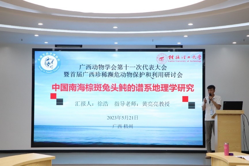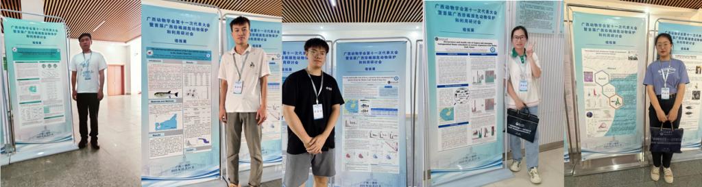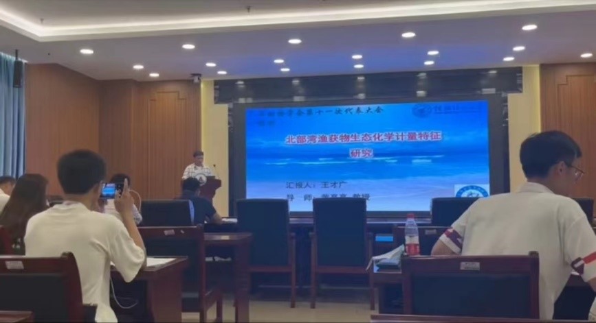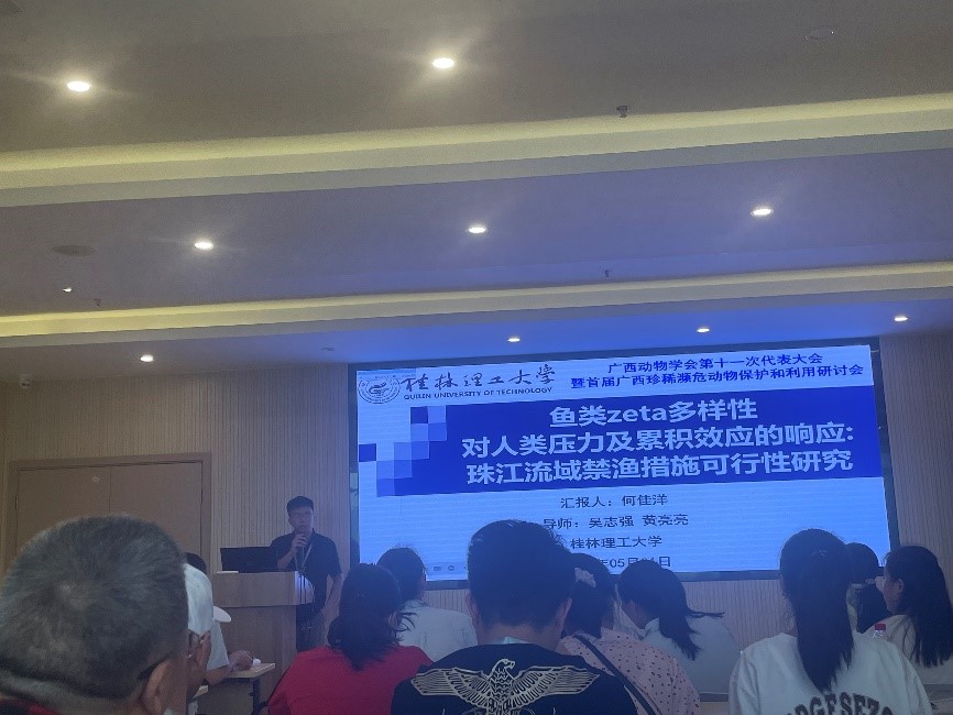 本次大会设置了行为与生态(一、二)、分子与进化、多样性保护共四个分会场,主要围绕动物行为、动物分类与生态、动物基因组与进化、动物多样性、动物生理等专题进行了报告交流。博士研究生何佳洋在“行为与生态”专题汇报了题为“Fish zeta diversity responses to human pressures and cumulative effects across a freshwater basin Feasibility study on fishing ban measures in the Pearl River Basin”的成果,研究结果确定了可能对生物多样性影响最大的人类压力源,为珠江流域乃至其他淡水流域进一步的禁渔政策提供理论依据;硕士研究生王才广在“行为与生态”专题汇报了题为“北部湾渔获物生态化学计量特征研究”的研究成果,为海洋生物地球化学循化及渔业资源的保护和管理提供科学依据;硕士研究生徐浩“分子与进化”专题汇报了题为“The phylogeographical pattern of the Lagocephalus spadiceus (Tetraodontiformes: Tetraodontidae) in the South China Sea”的研究成果,为棕斑兔头鲀的资源保护和育种研究提供了依据;硕士研究生苏琼源、朱亮和承亚男在 “分子与进化”专题分别汇报了题为“北部湾三种优势鱼类重金属污染和碳氮稳定同位素特征研究”、“北部湾渔获物 PCBs 和 PBDEs 污染特征及健康风险评估”和“Occurrence and health risk of legacy and emerging halogenated flame retardants in marine organisms from Beibu Gulf, China”的研究成果,为北部湾海洋环境管理和海产品食用安全提供参考。