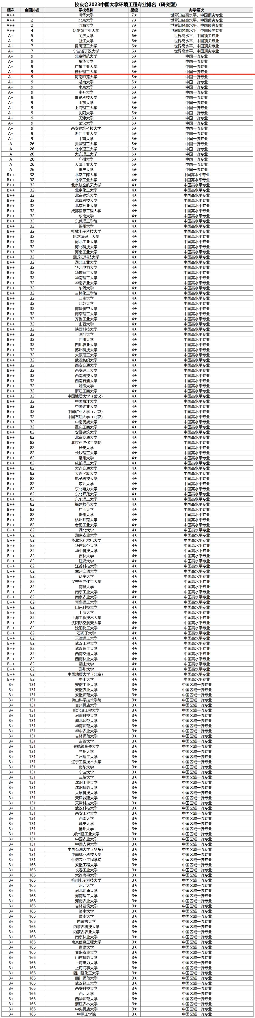 榜单显示,清华大学(7★,A++)办学实力最强,最具竞争力,办学水平最高,夺得2023校友会中国大学环境工程专业排名(研究型)冠军。河海大学(7★,A++)、北京大学(7★,A++)位列第2。哈尔滨工业大学(7★,A++)位列第4。浙江大学(6★,A+)、昆明理工大学(6★,A+)、同济大学(6★,A+)位列第5。宁波诺丁汉大学(6★,A+)位列第8。北京师范大学(5★,A+)、东华大学(5★,A+)、广东工业大学(5★,A+)、黑料吃瓜网