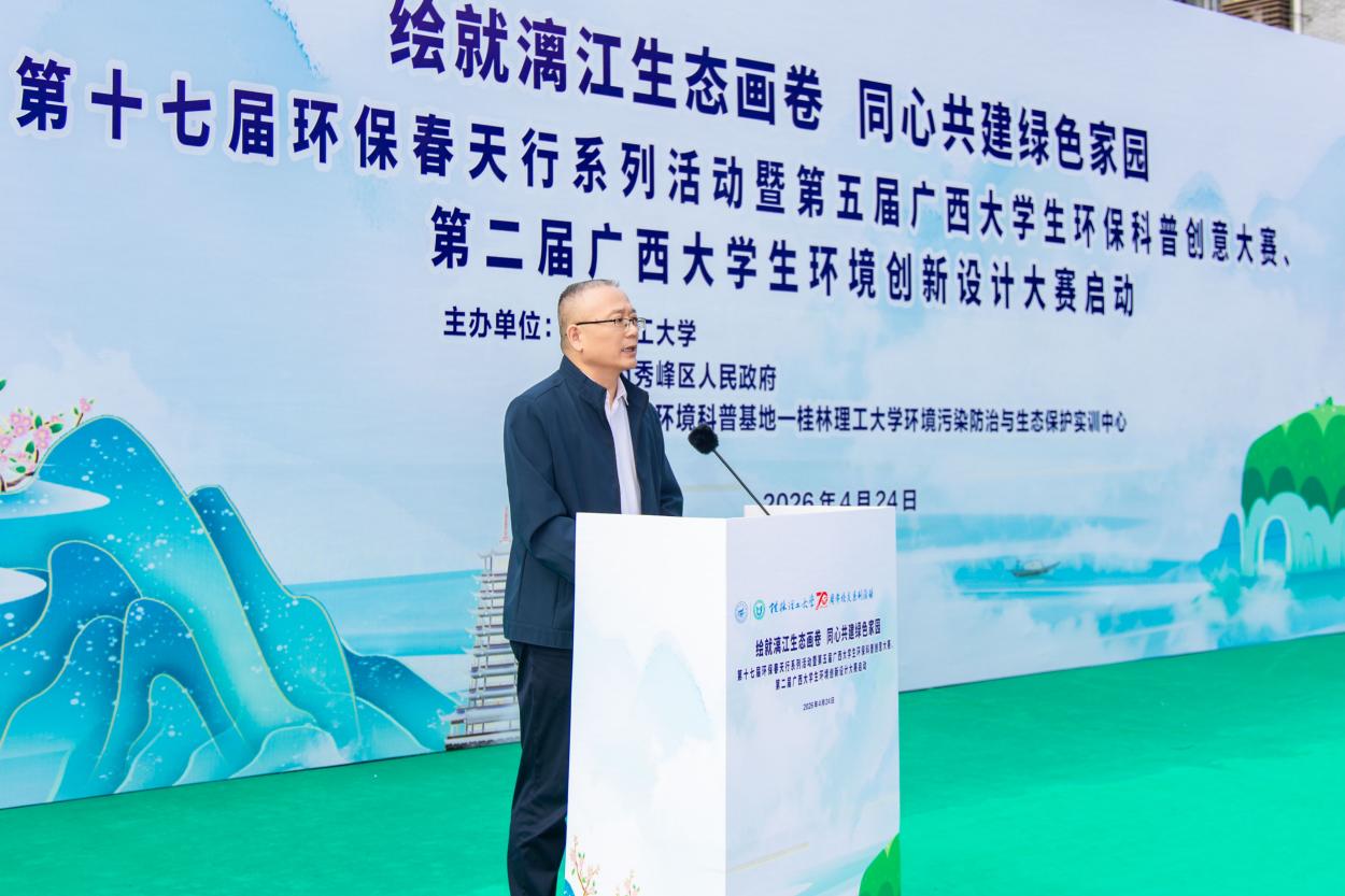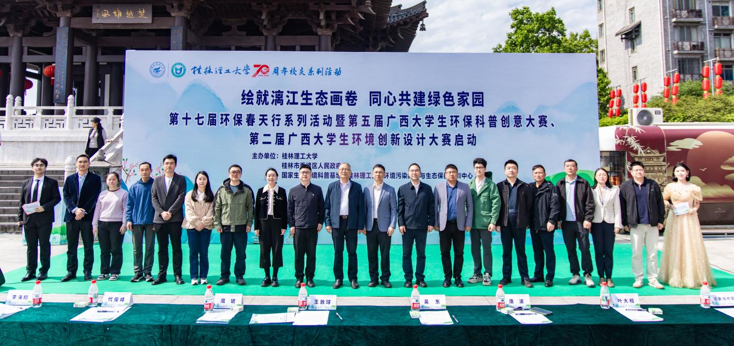 环境污染防治与生态保护实训中心联合主办的第十七届“环保春天行”系列活动暨第五届广西大学生环保科普创意大赛、第二届广西大学生环境创新设计大赛启动仪式在桂林市秀峰区滨江路逍遥楼广场举行。学校党委副书记、校长王敦球,桂林市秀峰区委副书记周琥,学校、秀峰区相关职能部门负责人,学院领导班子,高校师生代表及环保志愿者代表等共同参与本次活动。