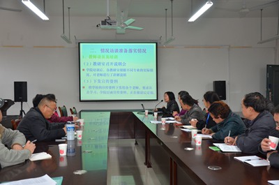 调研工作按模拟评估程序进行:首先,曾鸿鹄院长代表学院对本科教学审核评估的各项准备工作进行了汇报,然后,王副校长率队检查了档案管理情况,实地考察了学院的实验室、成果室等迎评准备布置情况,最后在学院会议室进行总结反馈意见。