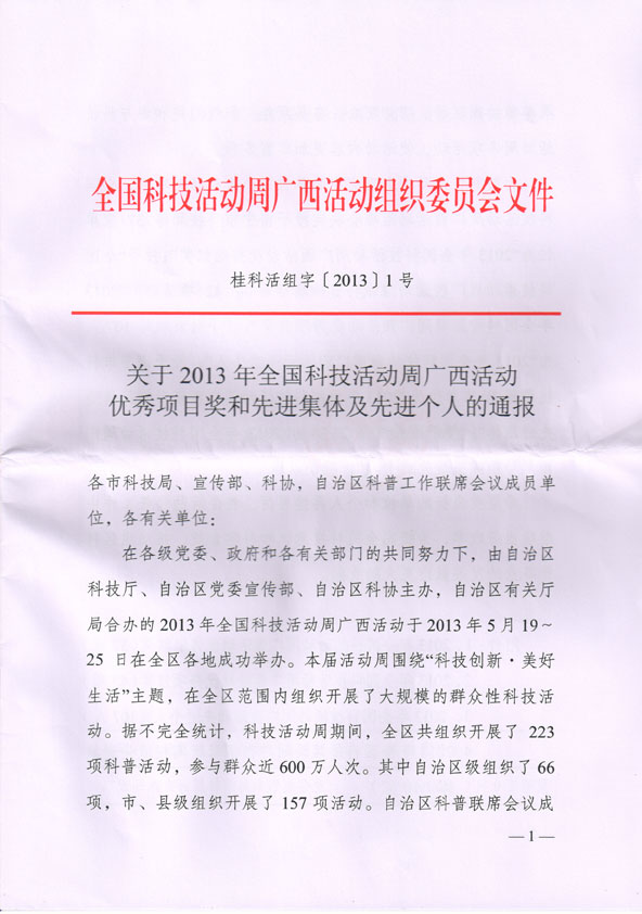从广西壮族自治区科学技术厅办公室获悉,全国科技活动周广西活动组织委员会下文(桂科活组字[2013]1号),在全区范围内评选并表彰了一批2013年度全国科技活动周广西活动优秀项目奖和先进集体及先进个人,黑料吃瓜网