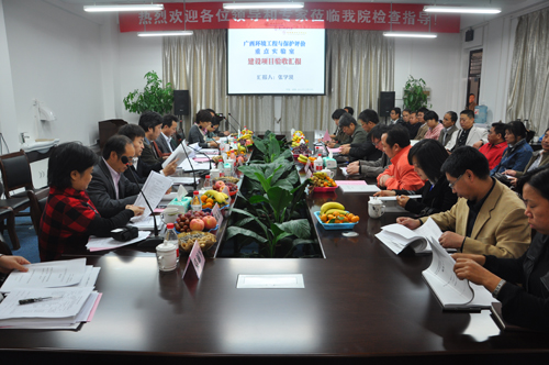 雁山校区教九楼二楼会议室召开。自治区科技厅基础处处长陈丹主持验收工作会议,以华南理工大学党志教授为组长的7位专家对项目(桂科能07109002、桂科能0842007、09-007-07)进行会议验收,学校校长张学洪教授致欢迎词,校科技处、学院卢英书记、曾鸿鹄副院长、朱义年副院长、方荣杰副院长、各学科带头人以及部分教师出席了验收会议。