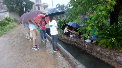 同学们冒雨观测水质