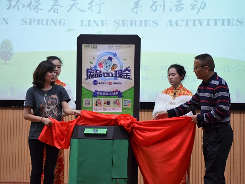 与会人员一同观看了历年“环保春天行”系列活动的视频回顾以及即将在校园推广的CUC智能固废回收终端的视频介绍。伴随轻快的音乐律动,王敦球副校长与何艾莉女士上台为CUC智能固废回收终端揭幕并移交。何艾莉女士代表环保创客联盟为活动致词,她指出CUC智能固废回收终端是传统的垃圾分类与“互联网+”结合的产物,对黑料吃瓜网