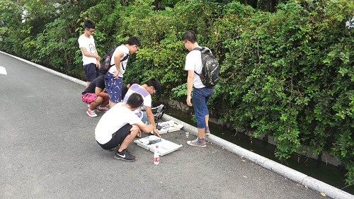 2014级水文专业学生在水文教研室王春振、徐勤学等7位老师带领下到雁山园附近进行水环境监测及评价实习。