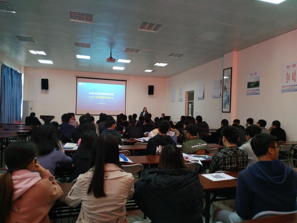 在宣讲会开始后,北控水务首先播放了一个视频短片让大家对该企业有了一个直观的初步了解。之后主讲人正式开始今天的招聘宣讲,第一部分介绍的是北控水务集团近几年的发展现状和取得辉煌成就,着重说明了北控水务集团在水资源循环利用和水生态环境保护方面是全球领先的企业。第二部分主讲人为大家解释了2019校园招聘的“新动力计划”,这一计划是北控水务集团培养青年中级管理人员及技术专家的人才发展计划。在岗位需求方面,北控水务2019校招提供了包括行政管理、人力资源管理、工程造价、水利规划等数十个可供选择的职位。在投递了简历后,集团会及时择优通知面试,北控水务承诺会让每一位新动力学员都能在企业中创造属于自己的未来。
