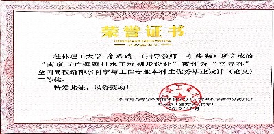给排水科学与工程专业2015级唐思婧同学的毕业设计(南京市竹镇镇排水工程初步设计,指导老师:李海翔副教授)获得优秀毕业设计二等奖。