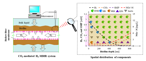 博士研究生蒋敏敏在张学洪教授团队的指导下,在氢自养反硝化领域取得重要进展:设计了一套以CO2作为无机碳源和控制pH值的氢基质生物膜反应器(CO2 source H2-based MBfR)用于处理地下水中的硝酸盐污染,并建立了数学模型对生物膜内的微生物代谢过程机理进行了原位解析。相关研究成果以标题“New insight into CO2-mediated denitrification process in H2-based membrane biofilm reactor: An experimental and modeling study”发表于环境领域国际顶级学术期刊《Water Research》(一区Top,2019年影响因子9.13)。