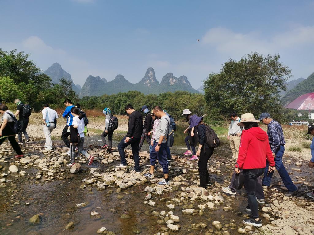 到达漓江边后,集体沿着江边步行一段,伴着江水的奔腾声,山水美景尽收眼底。大家一路走着、聊着、笑着,不亦乐乎,把所有的趣事、乐事都尽情地分享着,及其痛快。到达目的地后,由户外公司负责开展了拓展活动。活动现场,在教练的指导下,开展了多项集娱乐与健身为一体的活动,老师们积极参与到各项活动中,欢呼声、呐喊声在山谷间回荡着。