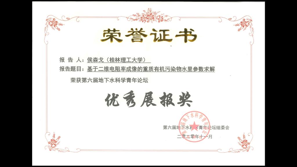 研究生李培华和侯森戈参加于2020年11月在成都举行的第六届地下水科学青年论坛, 两位研究生均在研究生专场作了学术报告, 并做了展报交流, 侯森戈荣获”优秀展报奖”(指导老师: 刘汉乐)。