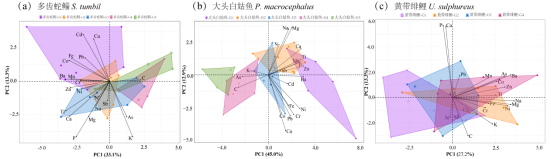 水域生态学组于2022年4月在北部湾中南部进行布点并采集32尾多齿蛇鲻、34尾大头白姑鱼及33尾黄带绯鲤,测定P、K、Ca、Na、Mg、Fe、Zn、Mn、Ti、Cr、Co、Ni、Cu、As、Ba、Cd、Pb和Sb元素含量和碳、氮稳定同位素(δ13C和δ15N)含量,分析多维化学计量生态位和碳氮稳定同位素营养生态位,比较这3种优势鱼类元素组成及其多维化学计量生态位和碳氮稳定同位素营养生态位的差异。结果表明,北部湾中南部海域3种优势鱼类元素含量和碳氮稳定同位素含量存在明显的种间及种内差异,其超体积生态位排序为大头白姑鱼(280.97)>多齿蛇鲻(174.45)>黄带绯鲤(98.30),生态位面积排序为多齿蛇鲻(6.63)>黄带绯鲤(4.00)>大头白姑鱼(2.46)。3种优势鱼类种间和种内均存在一定程度生态位重叠,如种间生态位重叠概率最高的是多齿蛇鲻与大头白姑鱼 (14.04%),而种间生态位重叠概率最低的是多齿蛇鲻与黄带绯鲤 (1.76%);种内生态位重叠最高的是黄带绯鲤,多齿蛇鲻次之,大头白姑鱼最小。此外,3种优势鱼类多维化学计量超体积生态位与种内差异有关,种内差异越大其超体积生态位越大。