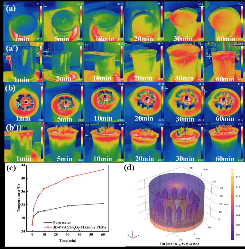 本研究以聚乙烯醇为原料,在其中掺杂具有良好光热转换性能的物理法少层石墨烯和具有良好光催化效果的α型氧化铋,通过原位聚合法、反复冻融法等方法制备出具有高蒸发速率和有效光催化降解有机污染物的三维改性聚乙烯醇碳基光热蒸发材料,进一步结合COMSOL模拟软件,从材料形状、表面辐射度、相对湿度、压力以及水汽温度、逸散速度等方面在给定蒸发环境下对进行分析并迭代优化。
