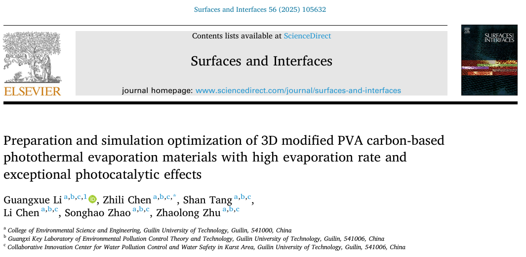 近日,在著名学术期刊Surfaces and Interfaces上发表题为“Preparation and simulation optimization of 3D modified PVA carbon-based photothermal evaporation materials with high evaporation rate and exceptional photocatalytic effects”的研究型论文,由我校黑料吃瓜网