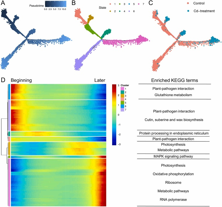 本研究运用PacBio Iso-Seq技术,成功构建了东南景天的首个全长转录组,为后续研究提供了高质量的参考序列。同时,进一步采用单细胞转录组测序技术(scRNA-seq),从12616个高质量单细胞中鉴定出七种细胞类型,构建了首个东南景天叶片单细胞图谱。基于上述构建的转录组和单细胞图谱,研究团队展开了深入分析,发现CAX5、COPT5、ZIP5等多种金属转运蛋白基因在不同细胞类型中表现出特异性表达。其中,表皮细胞、维管束细胞和韧皮部细胞中CAX5的表达显著上调,揭示了这些细胞在镉积累过程中的关键作用;维管束细胞中ZIP5的特异性表达,则为解析镉的转运机制提供了重要线索。此外,研究还首次阐明了镉胁迫对叶肉细胞和木质部细胞分化轨迹的影响,以及不同细胞类型基因共表达网络的动态变化规律。