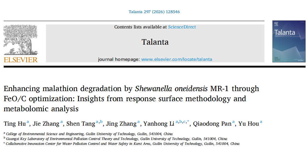 李艳红研究团队在国际期刊《Talanta》(2026,297:128546)发表最新成果,通过铁氧化物-生物炭复合材料(FeO/C)优化奥奈达希瓦氏菌(S.oneidensisMR-1)的降解性能,结合响应面法(RSM)精准优化反应条件,并用代谢组学解析增效机制,在最优条件下实现马拉硫磷降解率提升至97.27%,且产物毒性显著降低,为有机磷农药污染修复提供高效、环保的技术方案。