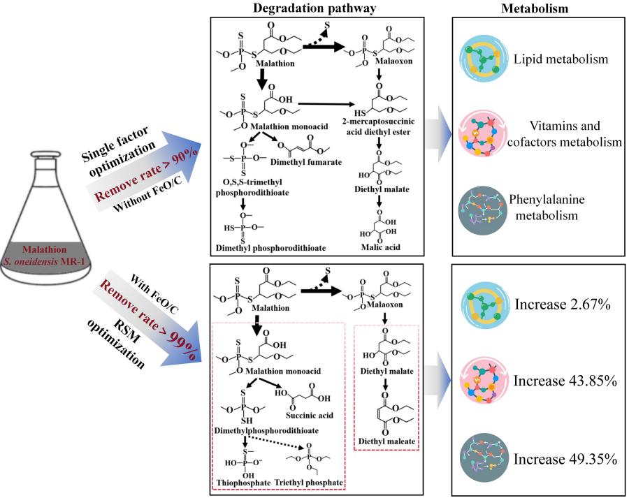 该研究不仅阐明了FeO/C增强微生物降解马拉硫磷的分子机制,更通过响应面法建立了可复制的优化方案,为有机磷农药污染场地的工程化修复提供精准的技术参数与理论支撑。