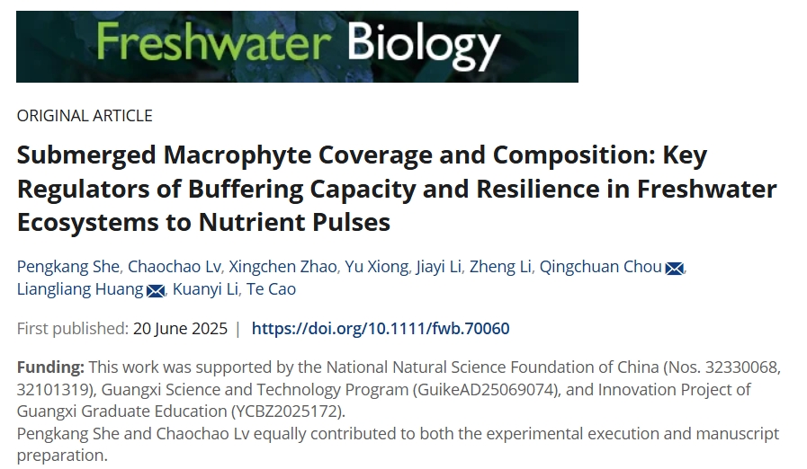 近日,在生态学知名期刊《Freshwater Biology》上发表了题为"Submerged Macrophyte Coverage and Composition:Key Regulators of Buffering Capacity and Resilience inFreshwater Ecosystems to Nutrient Pulses"的研究论文由我校黑料吃瓜网