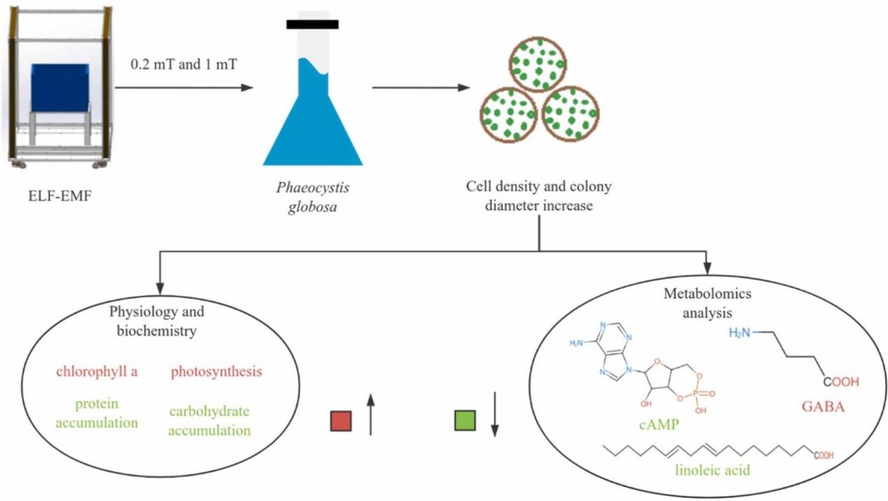研究发现,在极低频电磁场暴露下(0.2 mT和1 mT),球形棕囊藻均表现为前期适应环境生长缓慢,而后期生长繁殖加快。表明极低频电磁场暴露会引起球形棕囊藻应激,但适应后会促进生长。通过对生理生化指标的分析发现,其碳水化合物、蛋白质总量显著下降,而光合作用被显著增强。
