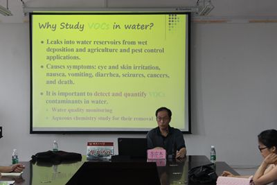 报告会上,李庄杰博士结合自己多年的教学和科研经验就“利用傅里叶变换红外衰减全反射定量测定水中几种挥发性有机物”技术进行了介绍,详细讲解了疏水性聚合物膜在晶体表面上的涂层技术;样品溶液的流量优化和不同的聚合物膜的厚度和增加光反射数对测定精度的影响,为学生更好地利用红外光谱分析测试环境污染物打好理论基础。