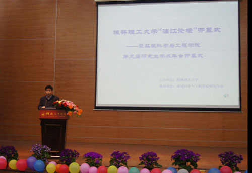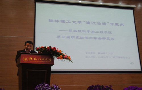 学校研究生处处长程道品教授应邀在开幕式上致辞,他首先祝贺“漓江论坛”的顺利举办,接着他强调了保护漓江这条母亲河的重要性,充分肯定本次论坛确定的“关注生态、保护漓江”这一主题和论坛举办的重要意义。他还进一步指出,漓江不仅仅是生态环境研究保护的对象,还是培养锻炼研究生的创新能力和科研能力的重要研究与实践基地,环境类等理工科专业和其他与经济社会发展联系紧密的社科联专业都可以围绕漓江保护和开发开展相关研究。他希望研究生能刻苦钻研、求真务实、多出成果、出好成果,以实际行动践行论坛的宗旨。