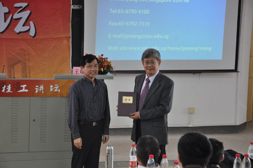 讲座之前,我校副校长陈学军教授为王靖元教授颁发了客座教授聘书。随后,讲座正式开始。在第一场讲座中,王教授向师生们介绍了新加坡南洋理工大学的废弃物资源化研究中心,详细讲述了该中心的研究项目,提出了将废弃物转化为资源加以利用的观念,以废弃物资源管理为先导,在处理工程中节约水资源与电能,改进污水、污泥处理工艺,提高土地资源的利用率,系统地提升环境质量。
