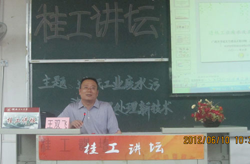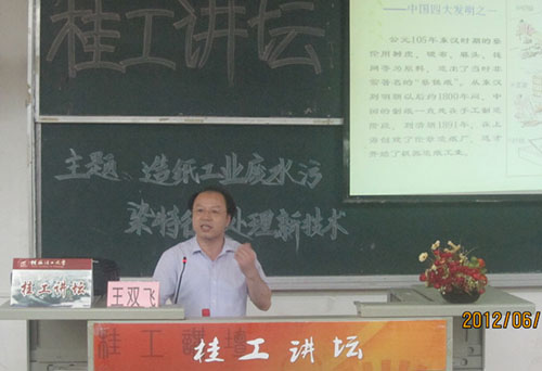 邀请,6月10日上午,广西大学轻工与食品工程学院院长、博士生导师王双飞教授做客桂工讲坛,在雁山校区05103教室为师生作了一场题为“造纸工业废水污染特征及处理新技术”的学术报告。学院院长王敦球主持了此次报告会,学院党委副书记周章明、辅导员唐红兵等相关专业师生参加了此次报告会。